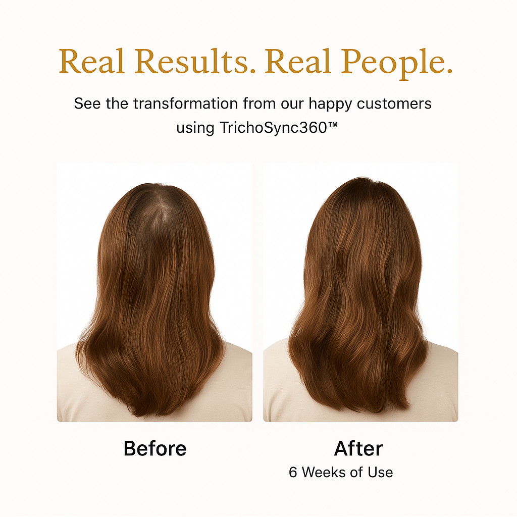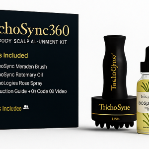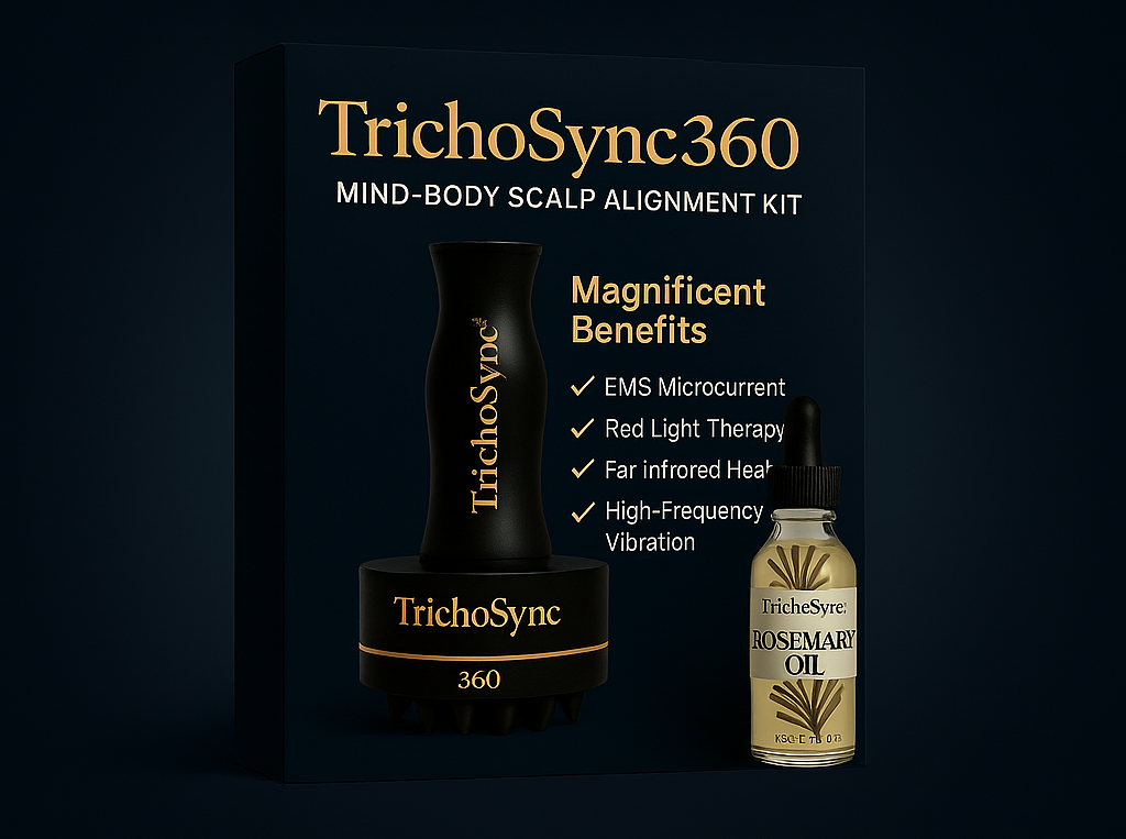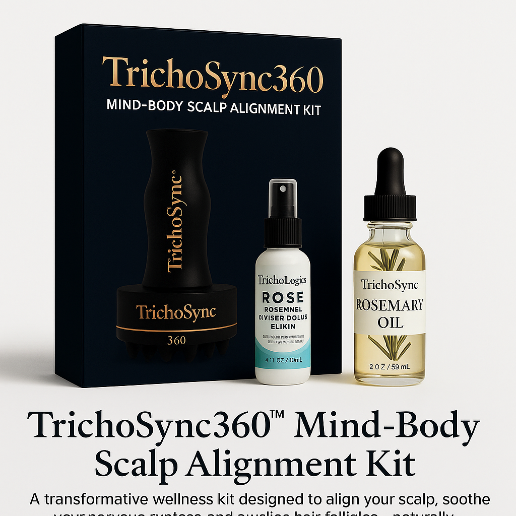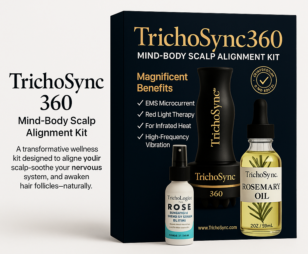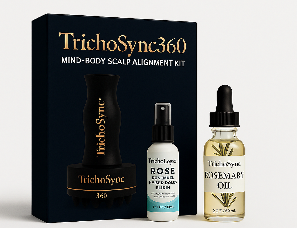 TrichoSync360™ isn’t just another scalp care kit — it’s a mind-body follicular alignment system. Backed by cutting-edge trichological science and therapeutic technology, TrichoSync360™ is formulated to: